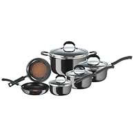 Constructed from heavy-gauge aluminum with a warp-resistant base, the cookware heats quickly and distributes heat evenly (no hot spots to worry about). It even comes with a Thermo-Spot heat indicator, which makes it easy to see at a glance when the cookware has preheated. For added convenience, the cookware's shiny enamel exterior comes protected with a TechnoGuard coating for long-lasting good looks, and its patterned TechnoTough nonstick interior helps ensure effortless food release without the need for excess butter or oil--plus it's scratch-resistant and can be safely used with metal utensils. The included tempered-glass lids, complete with vents and stay-cool loop lid handles, fit securely on the pots and pans to help retain heat and moisture. The cookware also provides ergonomically designed, riveted silicone handles that stay comfortably cool on the stovetop and offer hanging holes for spacing storage when not in use. Oven-safe up to 350 degrees F, the cookware cleans up easily by hand or in the dishwasher and carries a limited lifetime warranty.